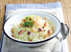 - Zelí obereme, nakrouháme a dáme vařit do většího množství osolené vody. Po chvíli scedíme a necháme na sítku dobře okapat. Stupeň měkkosti volíme dle svého gusta, pro strávníky s dobrým zažíváním volíme zelí křupavější. Nakrájíme špek nebo anglickou slaninu na kostky (v nouzi nejvyšší použijeme jakýkoli čerstvý tuk či olej), přiměřeně seškvaříme a přidáme nakrájenou najemno cibulku. Necháme krásně zesklovatět a okamžitě, tedy horké vmícháme do scezeného zelí. Důležité ingredience, kterými dílo dochutíme jsou dále cukr, sůl, pepř a ocet. Důkladně vše promícháme a podáváme lehce vlažné. Správným výsledkem je docílení lahodné, mírné sladko-kyselé chuti. Tento produkt se podává jako příloha ke svátečním obědům (vhodný k pečenému masu s brambory). Vzhledem k tomu, že babička měla manžela a tři syny, podávalo se s kusem čerstvého chleba a kouskem klobásky.