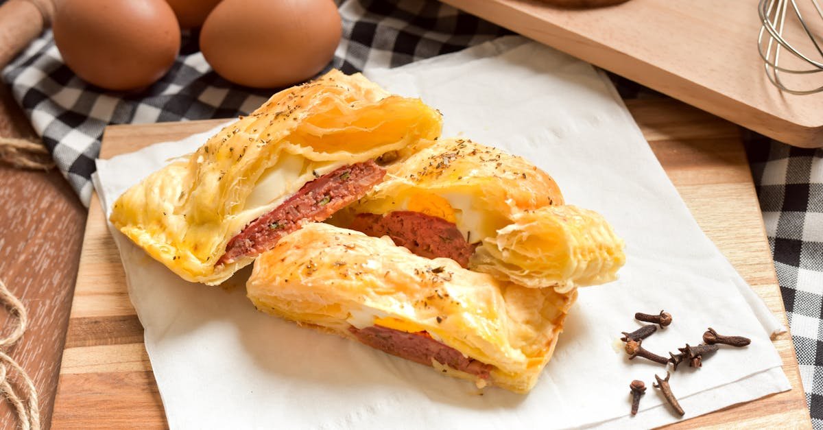 Do jamky rozklepneme vejce. Opatrně zabalíme do trojúhelníku — vejce nesmí vytéct. Okraje slepíme vodou. Smažíme v horkém oleji z obou stran dozlatova (asi 2 minuty). Žloutek má zůstat tekutý uvnitř.