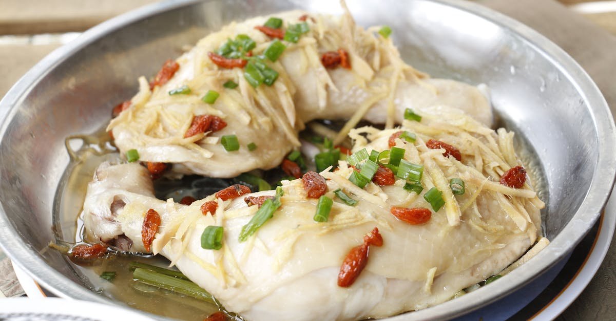 Kosti a kůži můžeme použít jako základ drůbeží polévky. Žampiony očistíme a nakrájíme na plátky. Maso osolíme a v rozpáleném oleji opečeme ze všech stran. Přidáme drcený kmín, worcester a kečup, mírně podlijeme vodou nebo vývarem a dusíme do měkka. Ke konci tepelné úpravy přidáme ke směsi plátky žampionů, zázvor, jemně nastrouhané oříšky a dodusíme. Na talíři ozdobíme směs plátky mandarinek, obložíme kolečky vařeného vejce a petrželkou. Broskve rozpůlíme a ozdobíme neochucenou šlehačkou.